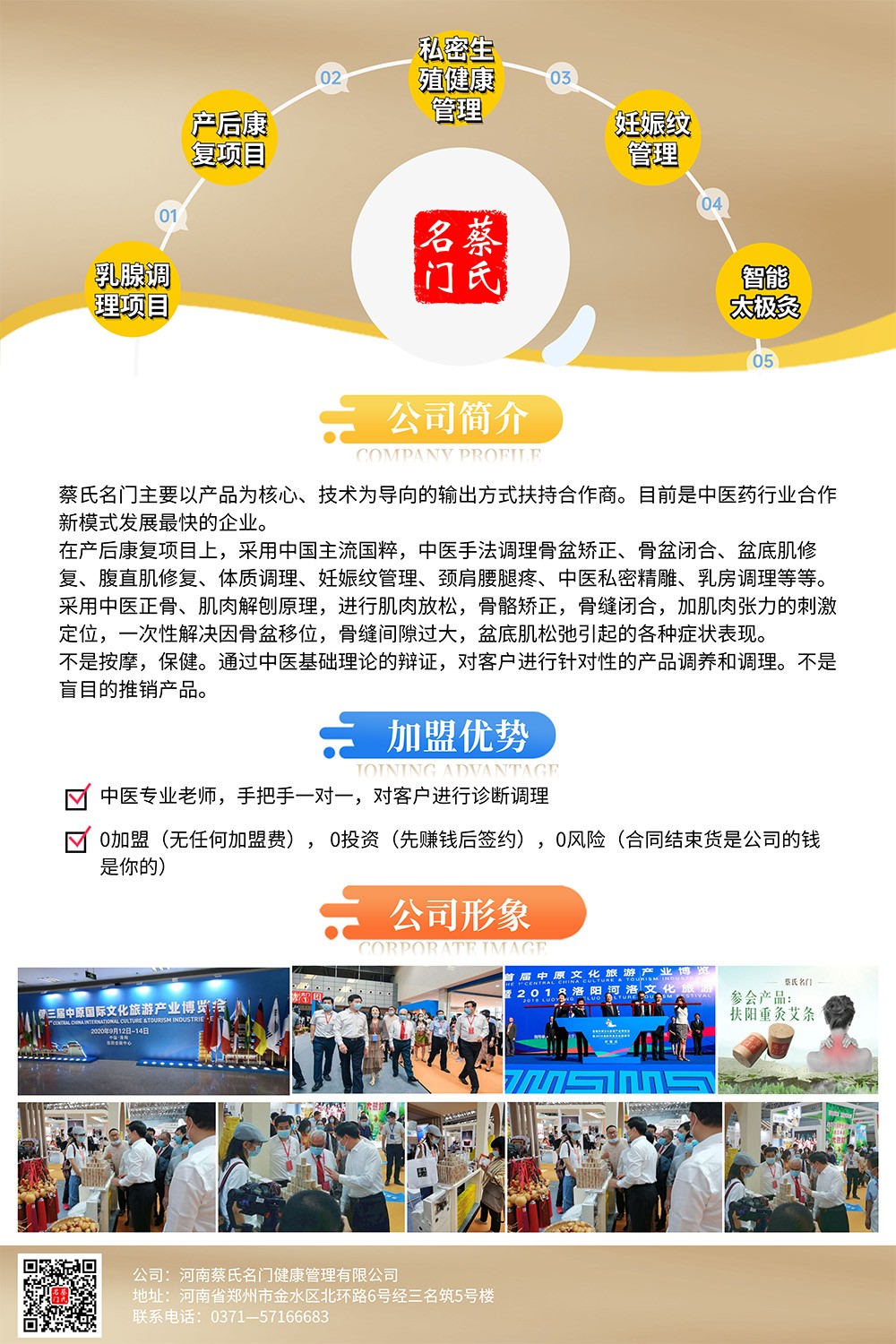 蔡氏名門主要以產(chǎn)品為核心、技術(shù)為導(dǎo)向的輸出方式扶持合作商。目前是中醫(yī)藥行業(yè)合作新模式發(fā)展較快的企業(yè)!