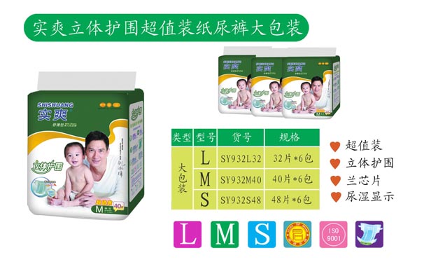 品牌名稱:實爽 主營產品:實爽嬰幼兒紙尿褲招商 品牌特色:衛生舒適 超薄鎖水