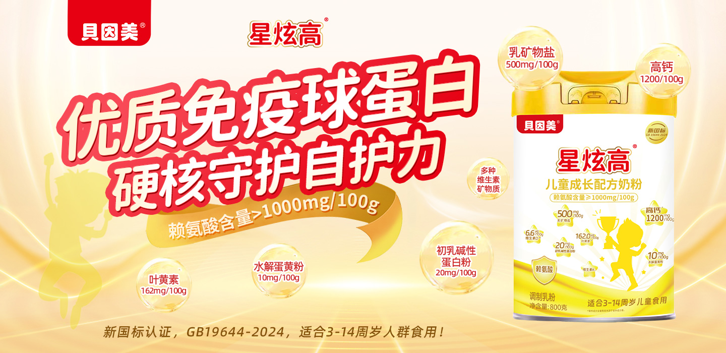 貝因美星炫高兒童成長配方奶粉,新國標認證,GB19644-2024,適合3-14周歲人群食用!嚴選優質奶源,源頭把控!賴氨酸含量>1000mg/100g,高含量更營養!同時,每100g更添加乳礦物鹽500mg,高鈣1200mg,初乳堿性蛋白粉20mg,水解蛋黃粉10mg,葉黃素162mg,同時富含多種維生素和礦物質,均衡營養配比,好消化好吸收,守護成長健康!