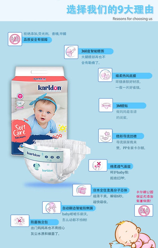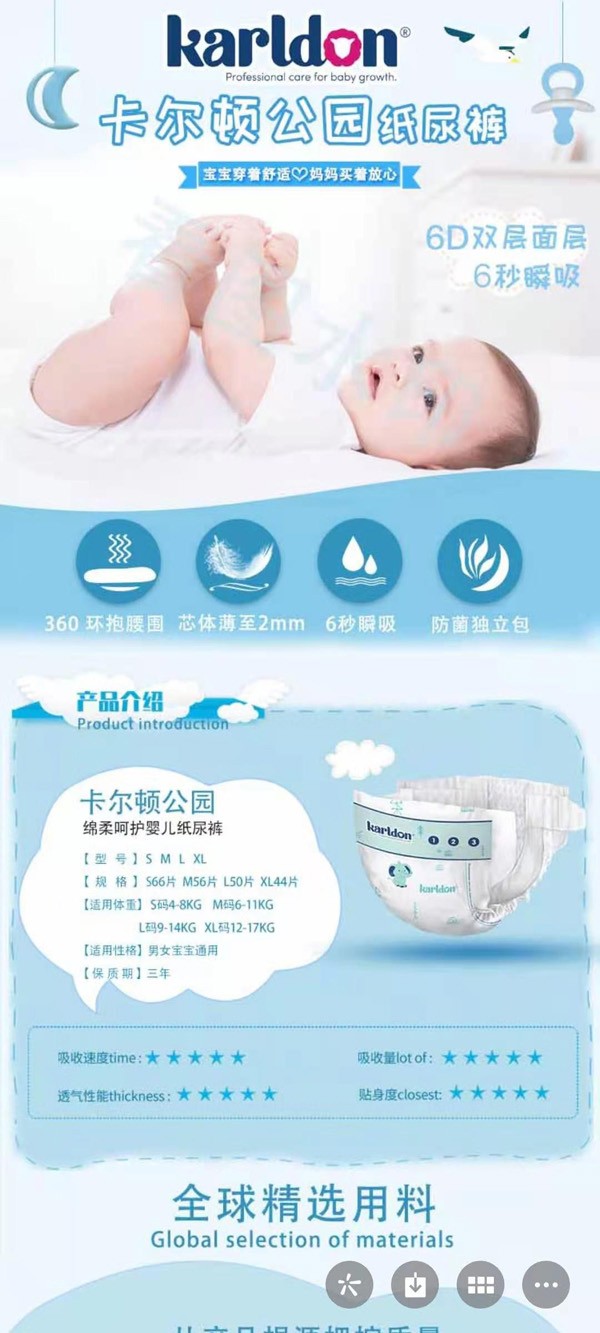 卡爾頓公園紙尿褲,專為長時間使用而設計,能持久保持寶寶小屁屁干爽,透氣加倍,遠離紅屁屁!快速6秒瞬吸鎖水,超薄柔軟,百分百全住友吸水因子,當然更“靠譜”!6D復合技術,隱藏式導流凹槽工藝,上億個微孔透氣,干爽加倍,舒適加倍!同時更采用人體工程學設計,貼合小屁屁,減少腿部摩擦,穿脫建議,寶寶喜歡,媽媽省心!