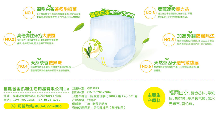 “FD白茶紙尿褲”將福鼎白茶成分融入于紙尿褲中。白茶紙尿褲在保持傳統嬰兒紙尿褲產品已有的諸多特點外,另有多項創新的產品亮點,可主要概括為:1、“FD白茶紙尿褲”定位為中高端客戶;2、獨特白茶加工工藝表層;3、獨特的尿后無異味功能;4、X型檔部設計;5、超薄強力吸收層快速分流尿液;6、獨特的腰部加寬設計。