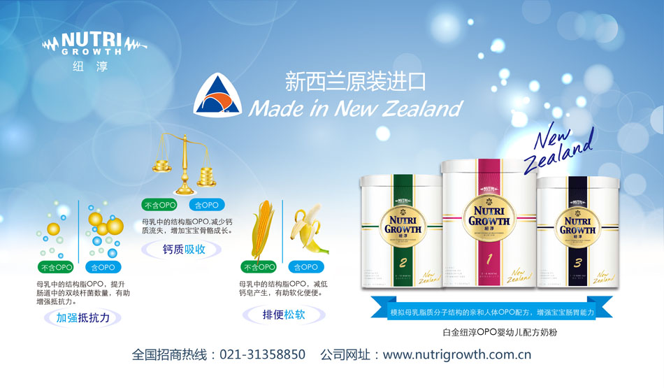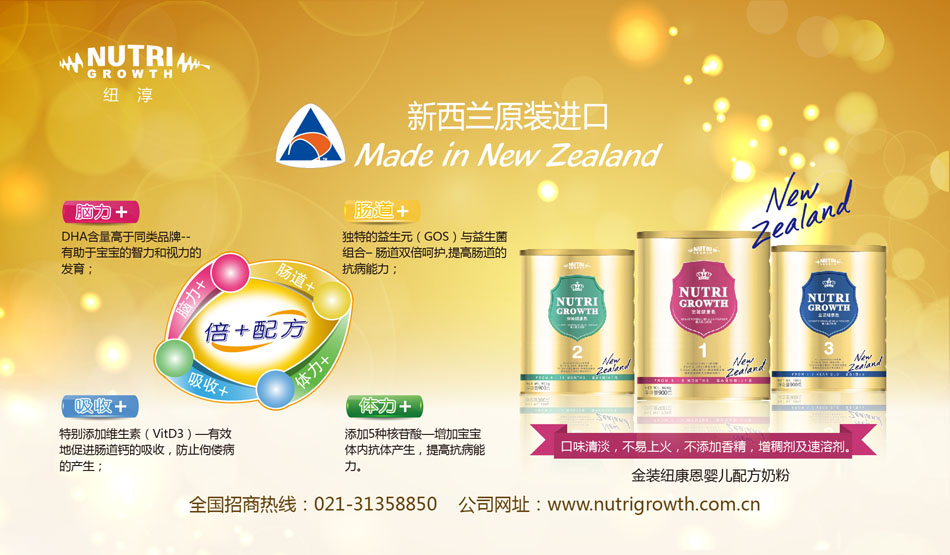 Nutri Growth New Zealand Limited(紐淳)是一家來自于新西蘭的獨資型乳品企業,專注于高品質牛乳/乳酪/嬰幼兒奶粉/營養食品,與著名奧克蘭大學(University of Auckland)的醫學和健康科學學院(Faculty of Medical Health Sciences)合作,建立高標準品質保證體制,為廣大消費者提供安全、放心的食品(Comfort Foods) 是紐淳公司永遠的追求。