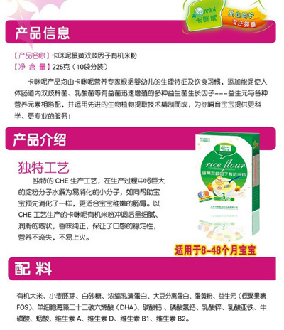 卡咪呢有機米粉系列是專為中國寶寶設計的營養輔食,選用有機大米,科學搭配維生素AD等維生素,還特別添加牛磺酸、DHA、AA等有助智力發育的營養成分,富含15種營養素。現上海卡咪呢母嬰用品有限公司面向全國空白市場區域誠招卡咪呢有機米粉代理商。