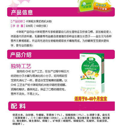 卡咪呢有機米粉系列是專為中國寶寶設計的營養輔食,選用有機大米,科學搭配維生素AD等維生素,還特別添加牛磺酸、DHA、AA等有助智力發育的營養成分,富含15種營養素。現上海卡咪呢母嬰用品有限公司面向全國空白市場區域誠招卡咪呢有機米粉代理商。