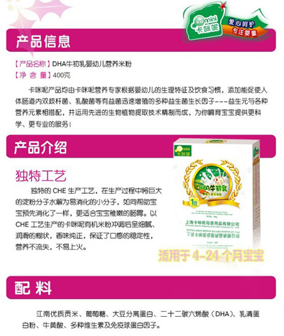 卡咪呢有機米粉系列是專為中國寶寶設計的營養(yǎng)輔食,選用有機大米,科學搭配維生素AD等維生素,還特別添加牛磺酸、DHA、AA等有助智力發(fā)育的營養(yǎng)成分,富含15種營養(yǎng)素。現(xiàn)上海卡咪呢母嬰用品有限公司面向全國空白市場區(qū)域誠招卡咪呢有機米粉代理商。