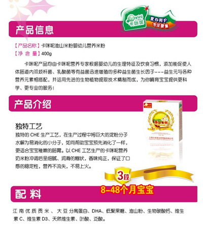卡咪呢有機米粉系列是專為中國寶寶設計的營養輔食,選用有機大米,科學搭配維生素AD等維生素,還特別添加牛磺酸、DHA、AA等有助智力發育的營養成分,富含15種營養素。現上海卡咪呢母嬰用品有限公司面向全國空白市場區域誠招卡咪呢有機米粉代理商。
