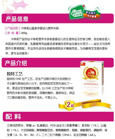 卡咪呢有機米粉系列是專為中國寶寶設計的營養輔食,選用有機大米,科學搭配維生素AD等維生素,還特別添加牛磺酸、DHA、AA等有助智力發育的營養成分,富含15種營養素。現上海卡咪呢母嬰用品有限公司面向全國空白市場區域誠招卡咪呢有機米粉代理商。