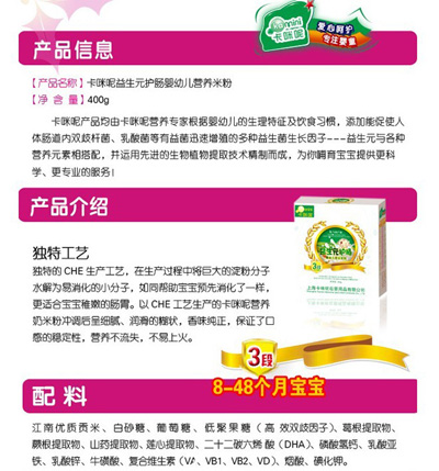 卡咪呢有機米粉系列是專為中國寶寶設計的營養輔食,選用有機大米,科學搭配維生素AD等維生素,還特別添加牛磺酸、DHA、AA等有助智力發育的營養成分,富含15種營養素。現上海卡咪呢母嬰用品有限公司面向全國空白市場區域誠招卡咪呢有機米粉代理商。