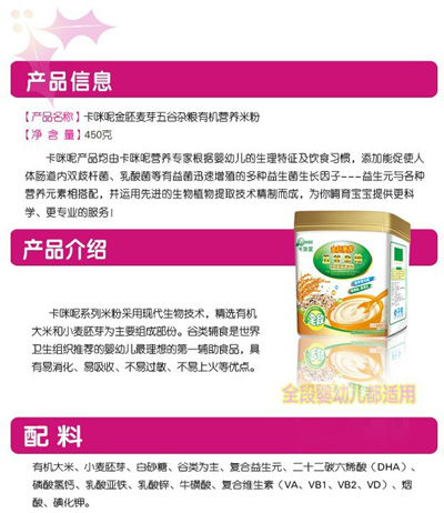 卡咪呢有機米粉系列是專為中國寶寶設計的營養(yǎng)輔食,選用有機大米,科學搭配維生素AD等維生素,還特別添加牛磺酸、DHA、AA等有助智力發(fā)育的營養(yǎng)成分,富含15種營養(yǎng)素,F(xiàn)上?ㄟ淠啬笅胗闷酚邢薰久嫦蛉珖瞻资袌鰠^(qū)域誠招卡咪呢有機米粉代理商。