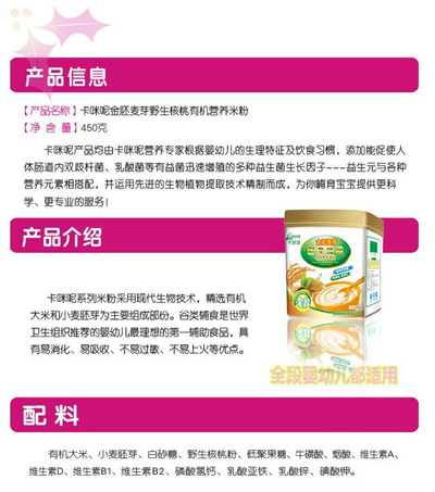 卡咪呢有機米粉系列是專為中國寶寶設計的營養輔食,選用有機大米,科學搭配維生素AD等維生素,還特別添加牛磺酸、DHA、AA等有助智力發育的營養成分,富含15種營養素。現上海卡咪呢母嬰用品有限公司面向全國空白市場區域誠招卡咪呢有機米粉代理商。