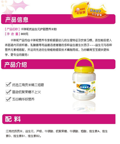 卡咪呢乳清蛋白嬰幼兒營養米粉是上?ㄟ淠啬笅胗闷酚邢薰酒煜庐a品,精選優質大米制作,特別添加乳清蛋白和益生元,提高寶寶抵抗力,促進寶寶changdao的消化吸收,上市以來廣受父母消費者的青睞。
