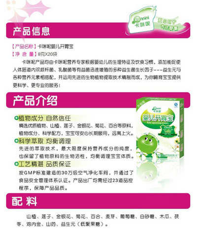 卡咪呢有機米粉系列是專為中國寶寶設計的營養輔食,選用有機大米,科學搭配維生素AD等維生素,還特別添加牛磺酸、DHA、AA等有助智力發育的營養成分,富含15種營養素。現上海卡咪呢母嬰用品有限公司面向全國空白市場區域誠招卡咪呢有機米粉代理商。