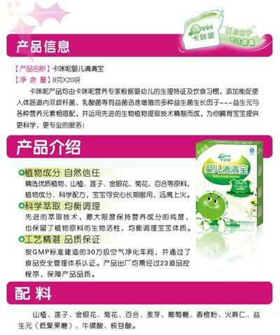 卡咪呢小兒板藍根顆粒是上海卡咪呢母嬰用品有限公司旗下產品,專為嬰幼兒設計,專業、安全,幫助寶寶可以預防感冒抵抗病毒,是廣大父母育兒的好幫手。卡咪呢小兒板藍根顆粒不含任何色素、防腐劑,安全放心。