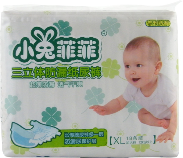 小兔菲菲三立體防漏紙尿褲是廣州咕嚕咕嚕嬰幼兒用品有限公司主打品牌產(chǎn)品。產(chǎn)品采用4層組合吸水芯片,能夠快速吸收尿液,避免尿液對寶寶肌膚的刺激,有效預(yù)防寶寶紅屁屁。