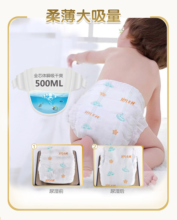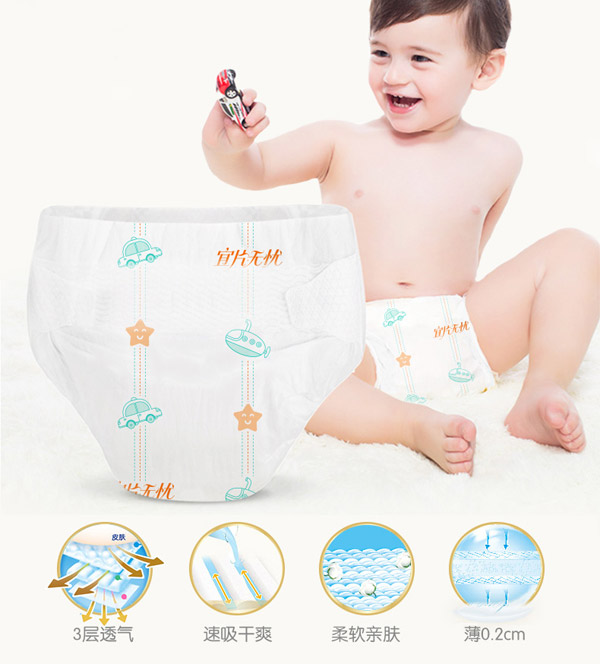 宜片無憂童趣紙尿褲采用熱風材質,親膚柔軟,選用柔軟熱風凸點無紡布作為面料,具有蓬松度高,彈性好,手感柔軟,透氣性好等特點,寶寶穿著舒適,玩的開心,睡得安心。