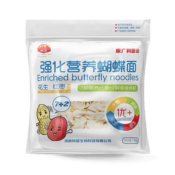 康廣利強化營養蝴蝶面,以優質面粉為原料,將蔬菜和面進行完美結合,采用先進工藝精心加工而成,易煮耐煮。經獨特用心調制淡淡的雜糧和蔬菜香味進入蝴蝶面的嚼勁里,讓寶寶的味蕾開始旅行。細滑面體,易消化。7種微量元素+2種多維食材,營養豐富。原生,天然,健康,安全。