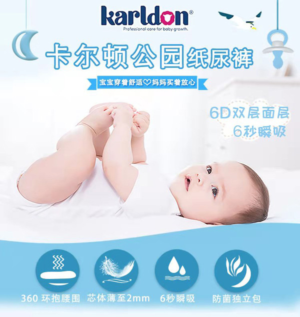 卡爾頓公園紙尿褲,專為長時間使用而設計,能持久保持寶寶小屁屁干爽,透氣加倍,遠離紅屁屁!快速6秒瞬吸鎖水,超薄柔軟,百分百全住友吸水因子,當然更“靠譜”!6D復合技術,隱藏式導流凹槽工藝,上億個微孔透氣,崗雙加倍,舒適加倍!同時更采用人體工程學設計,貼合小屁屁,減少腿部摩擦,穿脫建議,寶寶喜歡,媽媽省心!