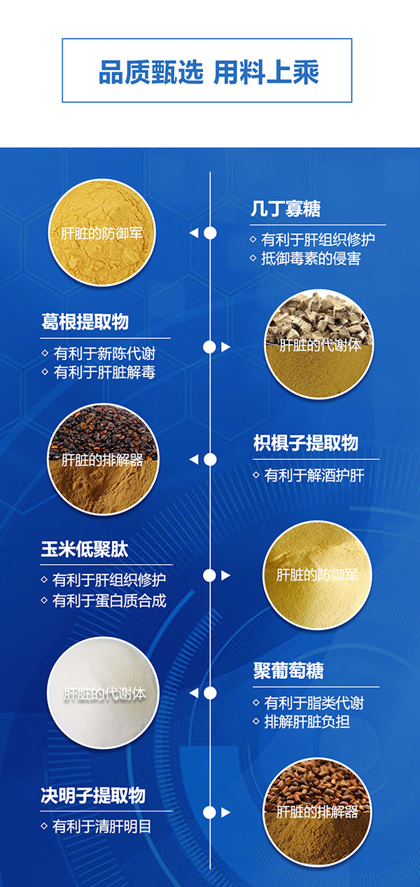 生命益元素天帝仁旰樂吧優選幾丁寡糖、葛根提取物、枳椇子提取物、玉米低聚肽、決明子提取物、聚葡萄糖為主要原料組成重要配方,運用優良的生產技術及工藝,經過嚴格的品質控制精致而成,保護肝臟,無懼熬夜酒戰。
