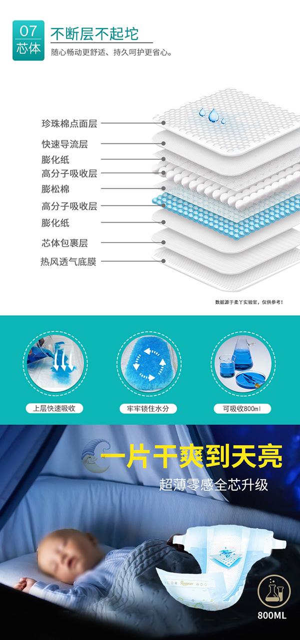 進口高分子結構,可以吸收約自身重量30倍的水分,保持屁屁持久干爽