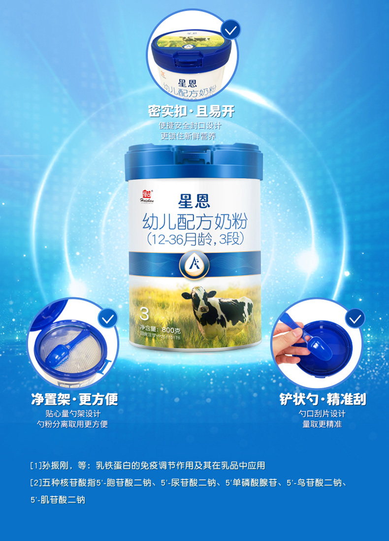 輝山星恩嬰兒奶粉,精選奶源,源頭把控,工藝鎖留,確保奶粉新鮮品質。生牛乳入料,并添加了DHA、ARA、益生元、牛磺酸等,科學配比,滿足成長階段的營養需求。奶香純正,口感細膩,易消化,好吸收。