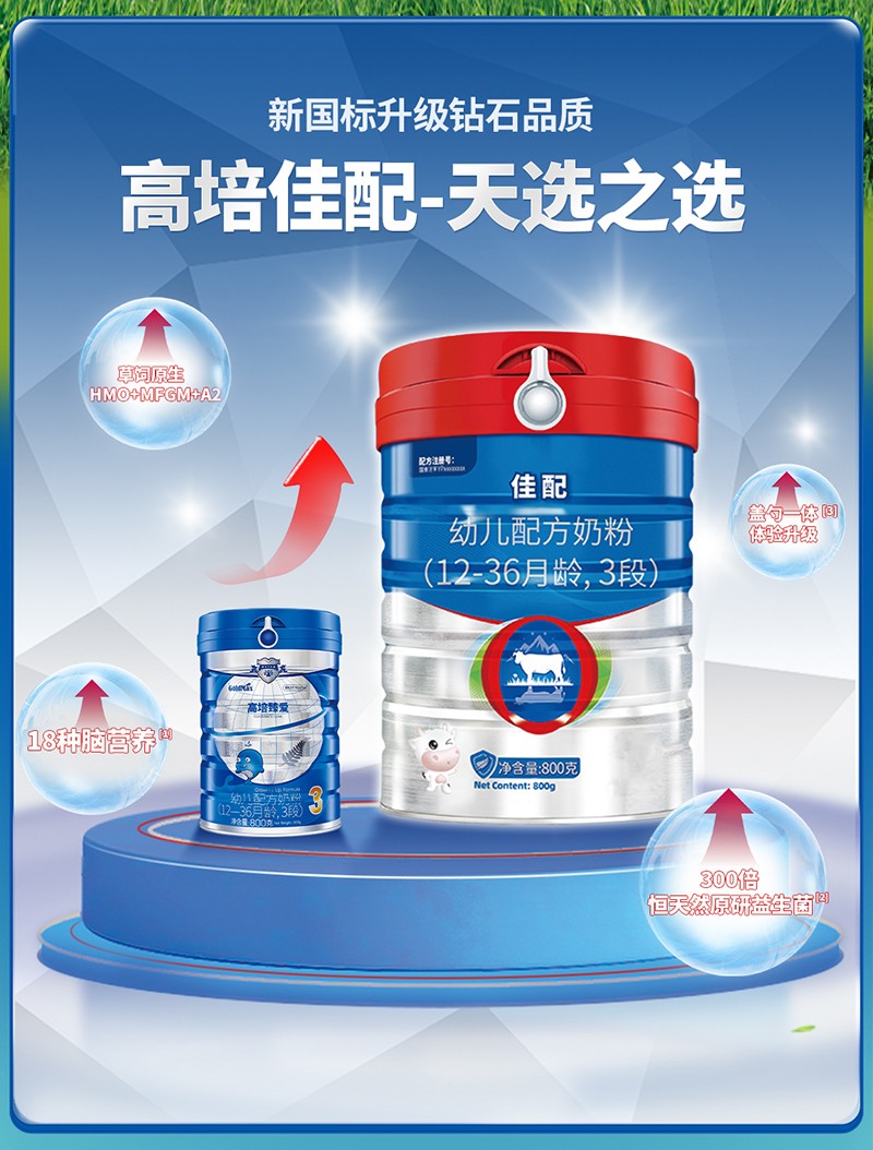 高培佳配幼兒配方奶粉,來自全球僅10%的臻稀草飼奶源,新西蘭AQ認證草飼奶源,96%鮮草喂養,350天戶外放牧,2000小時年日照,6畝地養1頭牛。配方中,科學添加18種腦營養、300倍益生菌。營養好吸收,成長更健康。