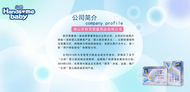 少帥,佛山市群芳嬰童用品有限公司主打嬰兒紙尿褲品牌!少帥紙尿褲,堅(jiān)持以用戶為中心,以用戶體驗(yàn)為產(chǎn)品設(shè)計(jì)理念。產(chǎn)品的設(shè)計(jì)人性化,采用的設(shè)備先進(jìn),質(zhì)檢也是相當(dāng)嚴(yán)格,形象代言人更是萌點(diǎn)十足