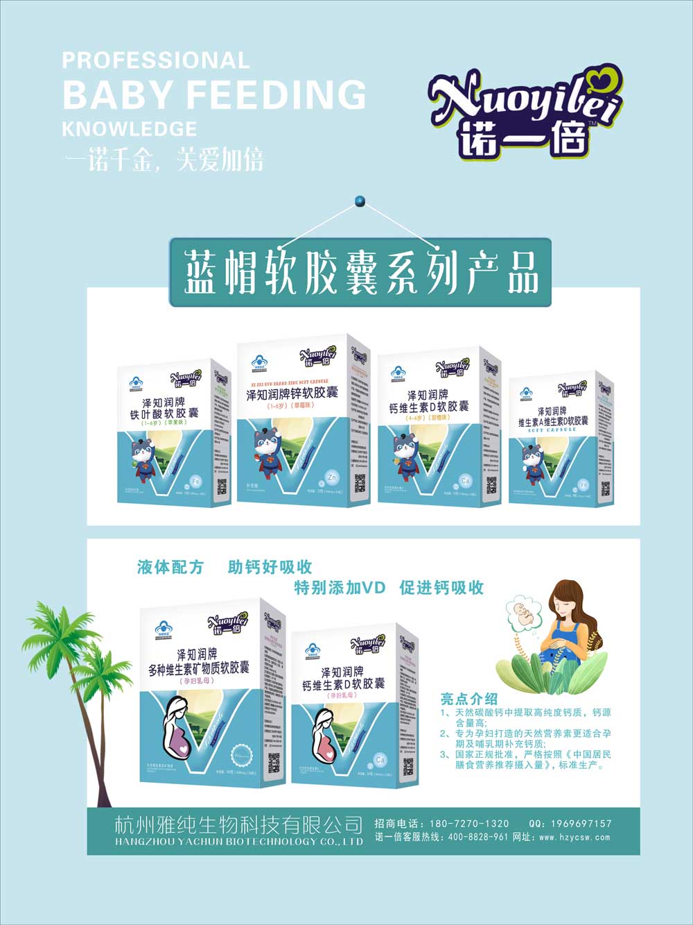諾一倍藍帽軟膠囊系列有鐵葉酸、鈣維生素D、鋅、多種維生素礦物質、維生素A維生素D等個配方單品,富含人體所需的鈣、鐵、鋅、維生素、葉酸等多種營養元素