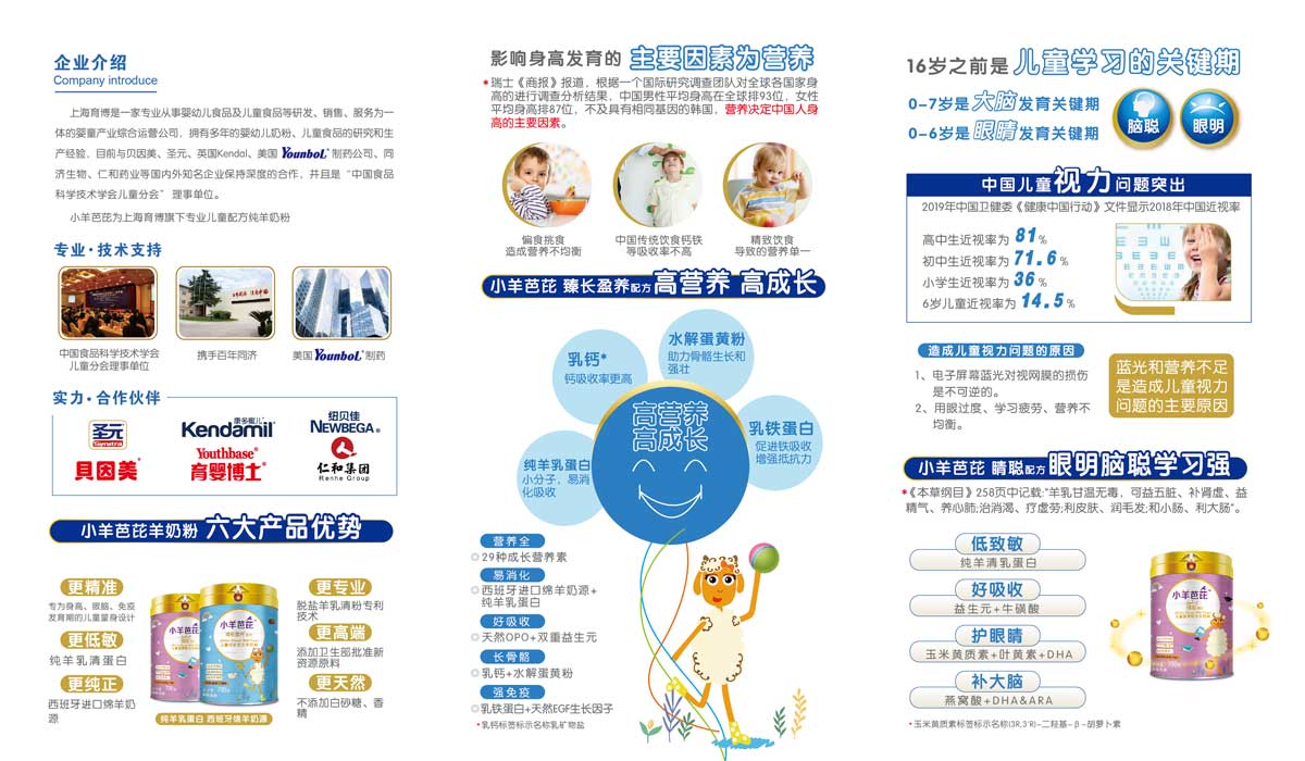 小羊芭芘為上海育博旗下專業兒童配方純羊奶粉,它是一家專業從事嬰幼兒食品及兒童食品等研發、銷售、服務為一體的嬰童產業綜合運營公司,擁有多年的嬰幼兒奶粉、兒童食品的研究和生產經驗,目前與貝因美、圣元、英國Kendal、 美國YunboL制藥公司、同濟生物、仁和藥業等國內外知名企業保持深度的合作,并且是“中國食品科學技術學會兒童分會”理事單位。