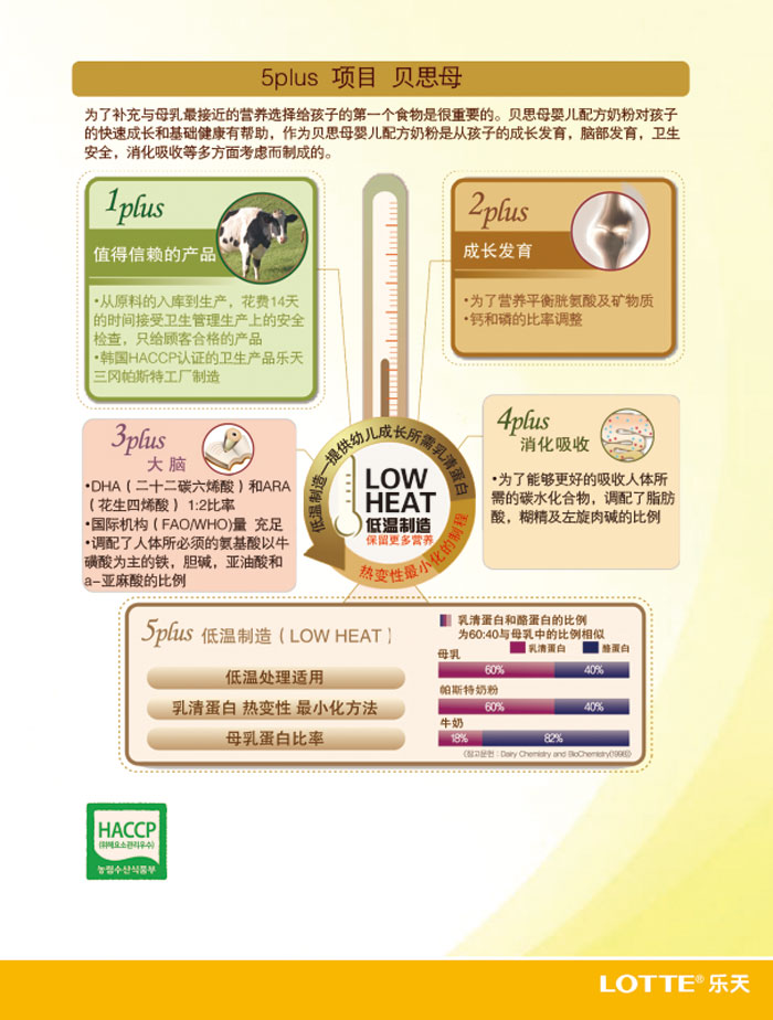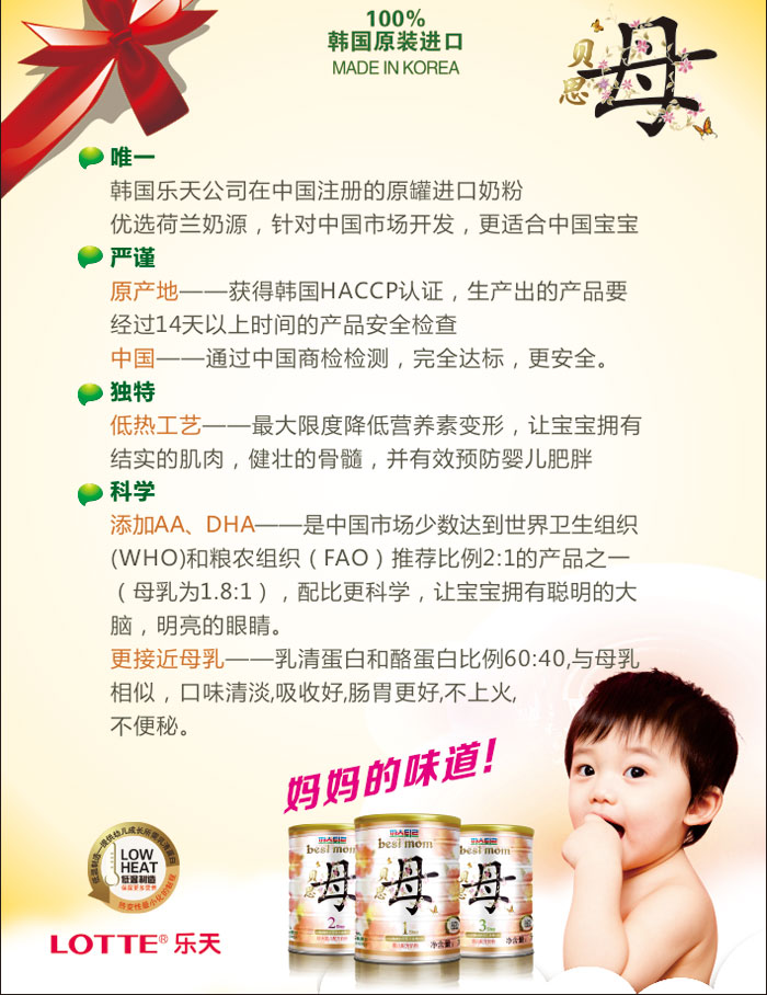 韓國樂天貝思母奶粉補(bǔ)充的營養(yǎng)是充分考慮嬰幼兒的四維生命科學(xué)規(guī)劃而制成的High-Class新概念調(diào)配奶粉,含有62種珍貴的營養(yǎng)成份,經(jīng)MSD多階段烘干處理產(chǎn)品,針對中國寶寶科學(xué)性設(shè)計(jì)。