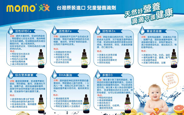 momo營養素滴劑系列,100%臺灣原罐原裝,正規進口食品,安全有保障。臺灣專業研發團隊,采用本土原材料,采用嚴格的自我生產管理系統,從 產品開發、原來生產到末端產品的包裝,提供完整的品質服務。現正面向全國招商中,有意向者現在就可以通過火爆嬰童網進行留言咨詢。