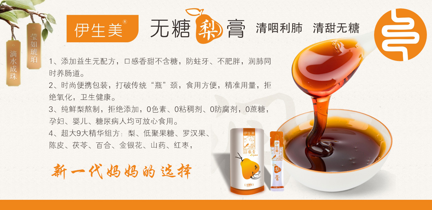伊生美無糖梨膏甄選食材,以梨、低聚果糖、陳皮、羅漢果、茯苓、百合、金銀花、山藥、紅棗為主要原料,采用先進的生產工藝制作,古方古法熬制而成,口感純正,清新怡人,不含糖,更健康。