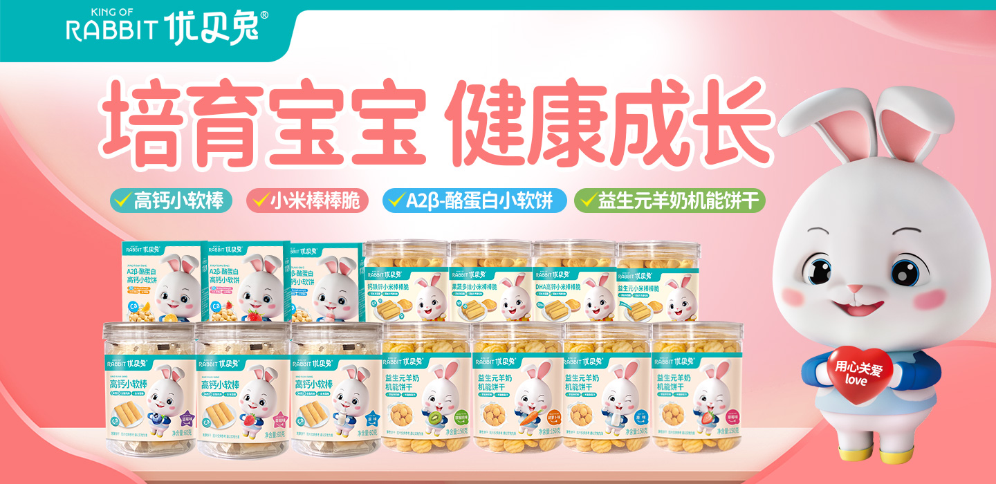 優貝兔品牌,主營產品有梨汁米餅、米乳球、泡芙條、益生元羊奶機能餅干、益生元羊奶溶豆等多個系列產品,均采用優質原材料,經過先進的生產工藝制作而成,安全健康,營養美味。