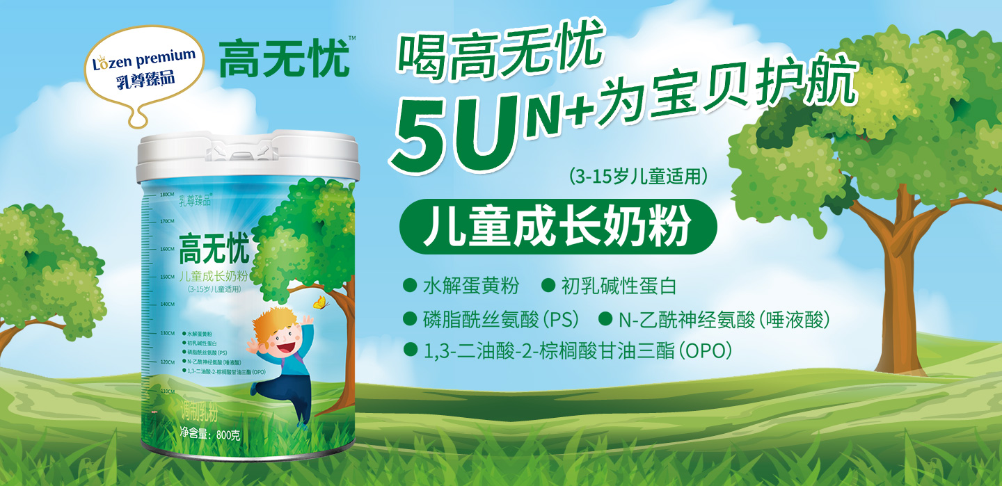 高無憂兒童成長奶粉,5U組合,全面均衡,助力體智活力齊發展。34種營養,15種維生素,9種礦物質,全面均衡營養,激發孩子全面成長力;(FOS+GOS+IMO)益生元+OPO組合,輕松消化營養好吸收;特添加CBP+水解蛋黃粉,激活骨骼生長原動力。濕法工藝,2小時鎖鮮,營養均勻,先進工藝,鑄就高品質,給兒童帶來“一站式”營養補充,為廣大家庭提供更科學的哺喂方案。