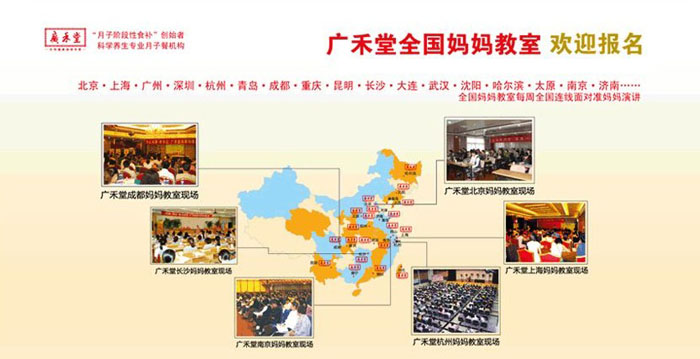自成立以來,廣禾堂分別與上海“國際和平婦嬰保健院”、“第一婦嬰浦東分院”、“長寧婦幼保健院”、“上海美華醫院”、“計生委宣教中心”、“龍鳳食品”等單位密切合作,共同致力于“正確的養胎及坐月子方法”科學理念的推廣。