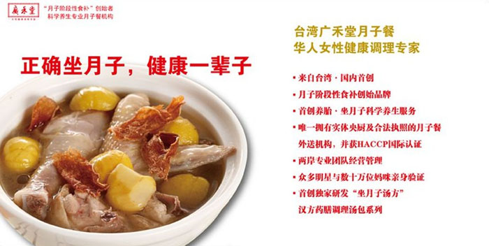 上海廣禾堂生物科技有限公司成立于2003年初,是中國大陸首家專門經營月子餐及女性健康調理的公司。最初由聞名中外的中西醫學博士莊淑旂女士的外孫女章美如老師帶領臺灣專業團隊經營管理。上海廣禾堂,也成為了繼臺灣廣和、美國廣和后又一家專業致力于月子餐經營的機構。