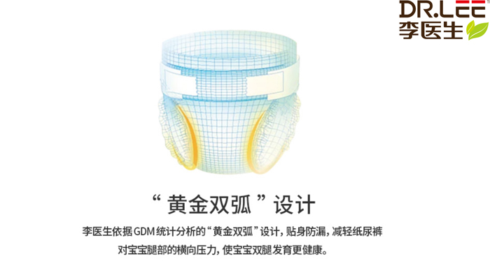 李醫生紙尿褲根據GDM統計分析的“黃金雙弧”設計,貼身防漏,減輕紙尿褲對寶寶腿部的橫向壓力,使寶寶雙腿發育更健康。采用高級吸水高分子,能夠鎖住多達自身重量50倍尿液,比傳統紙尿褲吸水量大,快速吸收