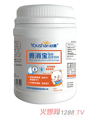幼善植物固體飲料,有善消寶、善清寶、善啤寶、金膳通、蒲公英甘草五大配方單品,傳承經典草本配方,科學配比,均衡營養。幼善植物固體飲料易溶解,易沖調,口感酸甜,小朋友們喜歡,家長更放心。