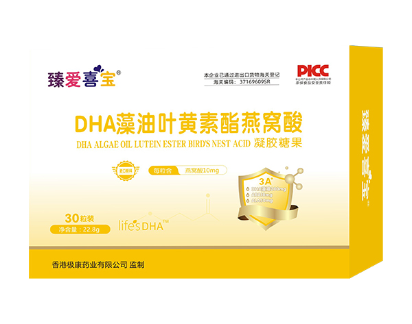 臻愛喜寶DHA藻油葉黃素酯燕窩酸凝膠糖果,甄選蒂斯曼進口原料life'sDHA,采用先進工藝制作,每粒含燕窩酸10mg,添加3A組合,DHA200mg、ARA10mg、ALA50mg,配比科學,營養均衡,甜橙味,口感好,易吸收。產品由中國人民保險公司承保,品質可靠,放心選擇。