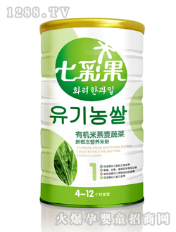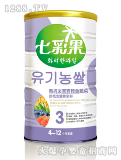 七彩果有機米鱈魚蔬菜米粉采用優質有機大米、白砂糖、脫脂奶粉、鱈魚粉、有機菠菜粉、有機淮山粉、低聚果糖、牛磺酸、單細胞海藻二十二碳六烯酸(DHA)、牛磺酸等各種原料精制而成。同時強化成長所需的鐵、鋅、鈣及維生素。引進臺灣GLT谷物液化技術,經先進的設備碾磨、蒸煮、液化、干燥、碎片制成。由于經過蒸煮處理,不需再煮,涼熱開水均可沖調,bao--bao容易消化吸收,是的優良谷類補充食品。