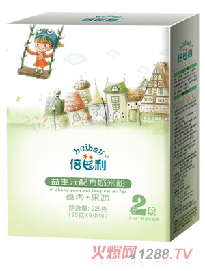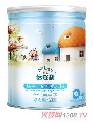倍芭利五果粉鐵鋅鈣益生元奶米粉添加了復合益生元(低聚果糖FOS、低聚半乳糖GOS)、復合礦物質、重要營養元素,能為正進入活潑好動,能量消耗大,而腦部及骨骼正處于高峰發育期的bao--bao提供均衡營養素及能量需要而配制的營養配方米粉。